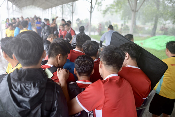 Sân tập chỉ có dãy hành lang với mái che bên trên nên gió thổi mưa lùa vào từ mọi phía. Ông Park đã phải mặc thêm áo khoác để chống mưa lạnh còn nhiều cầu thủ phải hoạt động tay chân cho cơ thể nóng lên. Sau khoảng 15 phút, nhận thấy mưa không hề có dấu hiệu giảm, HLV trưởng ĐT Việt Nam cho phép các cầu thủ trở lại xe buýt.