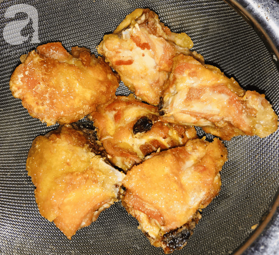 Cho gà vào chảo dầu chiên đến khi vàng giòn thì vớt ra.