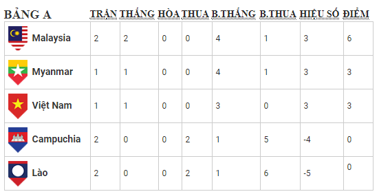 Bảng xếp hạng AFF 2018: